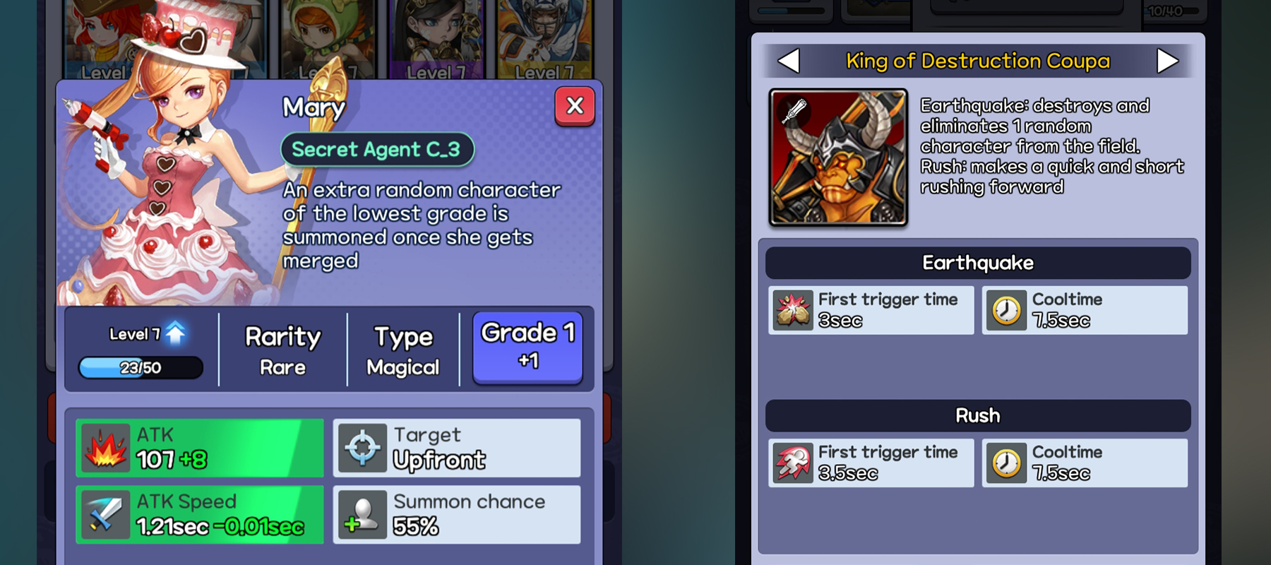 I was experimenting with my lineup to be honest, and I am taking chances on Mary the Secret Agent, who summons another character when merged. This is to anticipate King of Destruction Coupa, which eliminates one character in the field. He is really annoying.